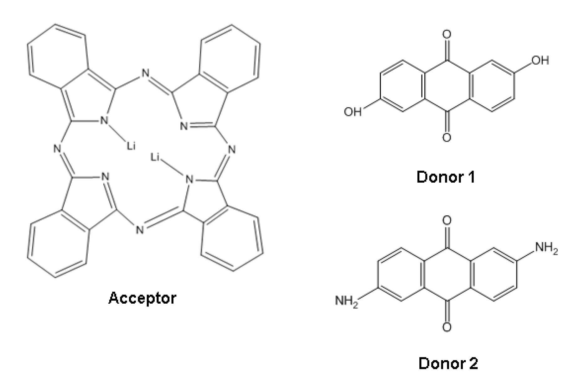 The electronic acceptor dilithium phthalocyanine was made to react with n moles of the organic donor (L1 or L2; see Figure 1). The dilithium phthalocyanine was selected for this study because it is a planar molecule and consists of four isoindole units linked by aza nitrogen atoms and two surrounding lithium atoms. A major property related to this structure is its thermal stability which makes it suitable for sublimation without breaking down [6,10].