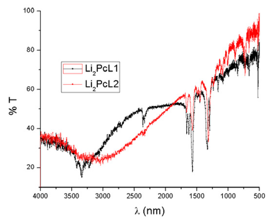 Infrared absorption spectra of Li2PcL1 and Li2PcL2.