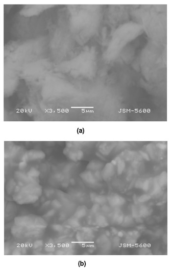 The SEM micrographs of the Li2PcL1 and Li2PcL2 thin films are shown in Figure 3. It may be observed that the surface morphology differs between these two materials. Notwithstanding the effort to maintain a constant deposition parameter, the different melting point for these complexes might prove to be an influence on the resultant morphologies. The thin film synthesized from the anthraflavic acid presents a m.p. of 310 °C, whereas the film synthesized from amine melts at 375 °C. Similar results have been obtained for thin films based upon phthalocyanine and its complexes (magnesium, manganese, iron, cobalt, zinc and lead phthalocyanine) [12,13]. Furthermore, the observed morphology for all materials in the SEM micrographs display an amorphous appearance; this being found in films based upon different materials whenever the low-pressure evaporation technique is employed for their deposition [3,4,5,10]. During the deposition process, when the molecules reach that portion of the substrate at the lowest temperature, their kinetic energy does not suffice in order for them to posses a high-enough surface mobility. Therefore, the long-reach order, characteristic of crystals, is not achieved and an amorphous film structure results.
