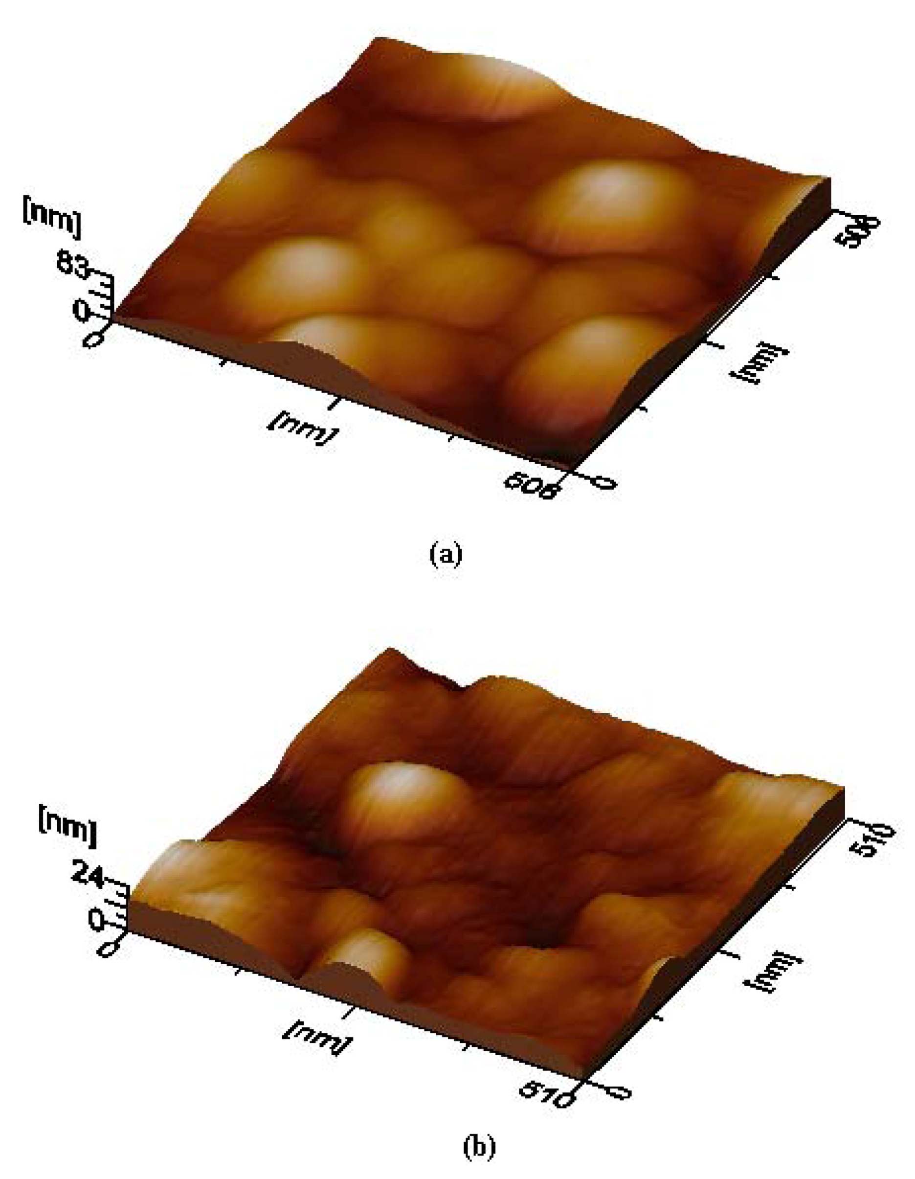 3D-micrographs obtained by AFM, showing the surface morphology of thin films deposited on quartz slices from: (a) The Li2PcL1 sample and (b) sample, Li2PcL2 respectively.