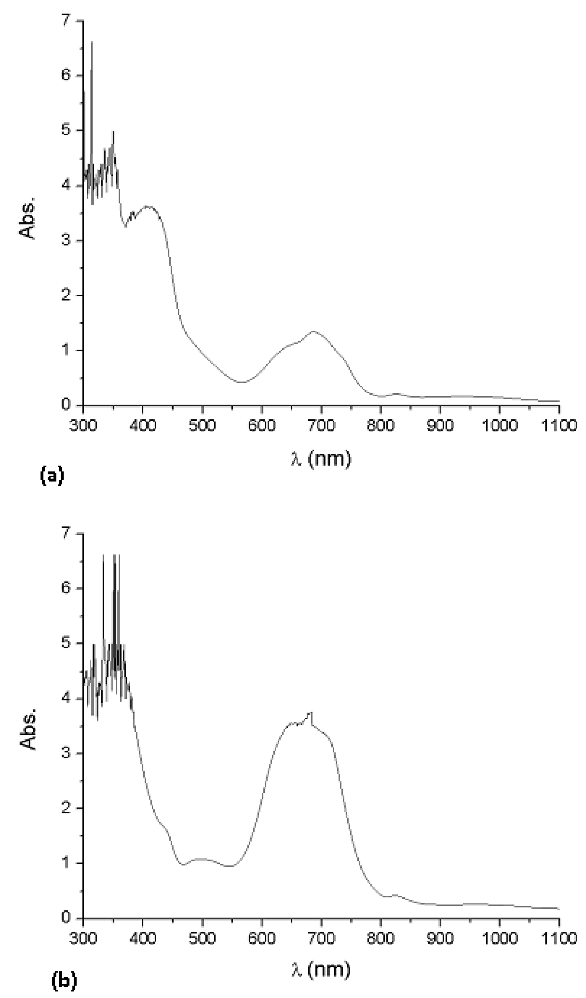 Optical absorption measurements are widely used to characterize the electronic properties of materials, through the determination of parameters describing the electronic transitions such as: band gap, valence band tails and excited state lifetime [2]. The band gap is deduced from the ultraviolet/visible absorption spectrum of the thin films. The spectra of Li2PcL1 and Li2PcL2 contain intense bands in the UV and visible ranges. The absorption spectra of the deposited Li2PcL1 and Li2PcL2 thin films with thicknesses of 4049 Å and 6447 Å, respectively, are shown in Figure 5. An increase of intensity of the absorption peaks, as the film thickness increases, is found. The UV-Vis spectrum observed for phthalocyanines thin films, originates from molecular orbitals within the aromatic 18π electron system and from overlapping orbitals on the central metal atoms [13]. Li2PcL1 and Li2PcL2 thin films show a strong Vis band (Q band) around 656 nm and two broad near-UV bands (B or Soret bands) at 370 and 328 nm respectively, consistent with a typical closed-shell metallo phthalocyanine [8,17]. In a similar fashion to the MgPc thin films [7], since the central Li metal atoms are devoid of d electrons, the mixing between metal and ligand orbitals is negligible, so that electronic transitions take place between ligand-centered orbitals, all transitions being π–π* in nature. The bands around 370–328 nm are due to electronic transitions between molecules, having an intermediate ionic degree, which conform the synthesized molecular materials. The Q band, can be attributed to the allowed highest occupied molecular orbital (HOMO)-lowest unoccupied molecular orbital (LUMO) (π–π*) transition in the phthalocyanine ring [18]. The maximum absorption peak in the Q band is assigned to a remote wavelength region owing to the coordination of ligand to metallic ions in the phthalocyanines. The presence of this absorption band may be interpreted as an overlap of π orbitals through the ligand.