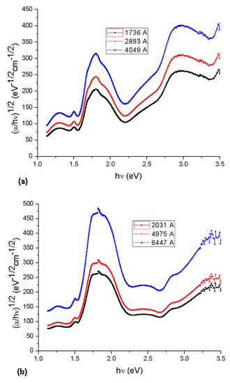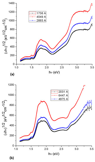 - Mok, T.M.; O’Leary, S.K. The dependence of the Tauc and Cody optical gaps associated with hydrogenated amorphous silicon on the film thickness: αl Experimental limitations and the impact of curvature in the Tauc and Cody plots. J. Appl. Phys. 2007, 102, 113525:1–113525:9. [Google Scholar]