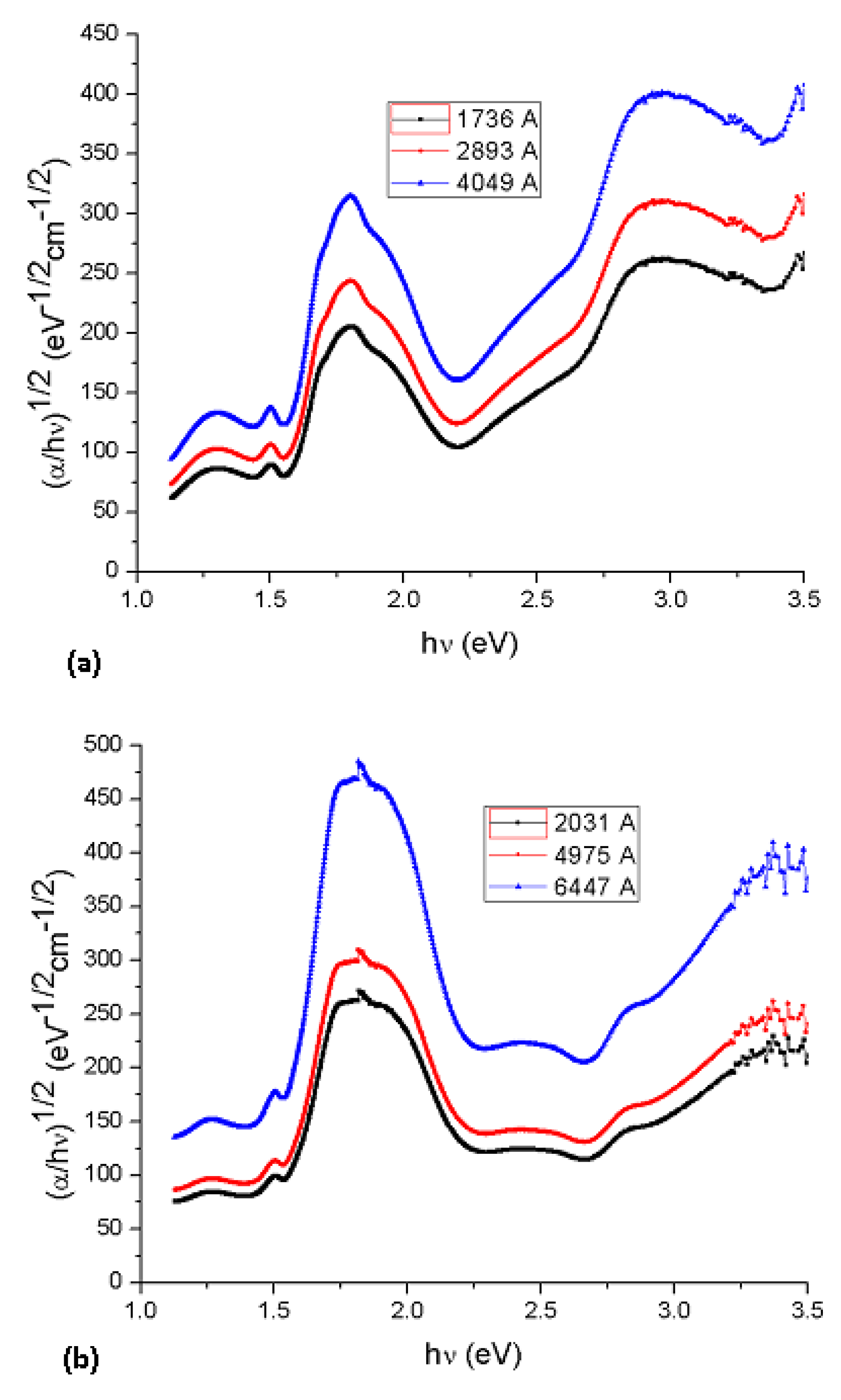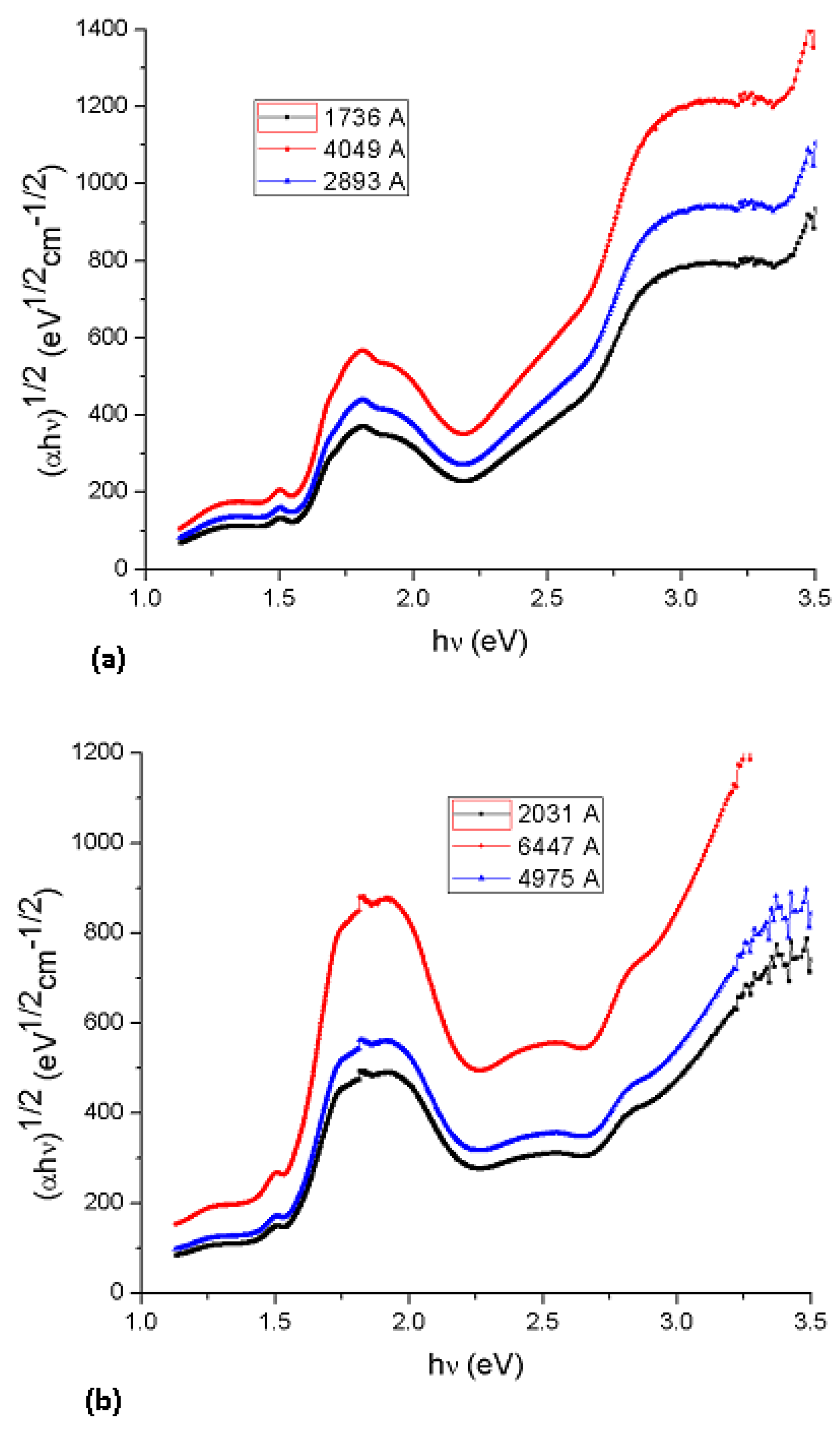where β−1 is the band edge parameter and n is a number characterizing the transition process which may take values 1/2, 1, 3/2 or 2, depending upon the nature of the electronic transitions responsible for the absorption [21]. At this point it may be recalled that, in amorphous semiconductors, optical transitions are described to a first approximation by non-direct transitions with no conservation of electronic momentum, for allowed indirect transitions n = 2 [22]. In order to gain some appreciation regarding how the film thickness associated with Li2PcL1 and Li2PcL2 influences the determination of the corresponding Tauc optical gap, consider Figure 6, in which Tauc optical gap determination are shown for three different film thicknesses for Li2PcL1 (4,049, 2,893 and 1,736 Å) and three film thicknesses for Li2PcL2 (6,447, 4,975 and 2,031 Å) [19]. Thus, the optical gaps for both indirect transitions could be determined by the extrapolation to zero of the linear regions in the (αhυ)½ = f(hν) plots. Figure 6 indicates that Li2PcL1 and Li2PcL2 thin films have a strong absorption band around 1.5 eV and another strong band between 2.3 and 2.43 eV. Similar results were obtained for NiPc thin films [13], the analysis of the spectral behavior revealing two indirect allowed transitions. Given the nature of the curvature, the Tauc optical gap corresponding to the thicker film is smaller than that of its thinner counterpart (see Table 2). This increase in the Tauc optical gap associated with Li2PcL1 and Li2PcL2, corresponding to decreasing film thickness, has been attributed to a number of factors [19].