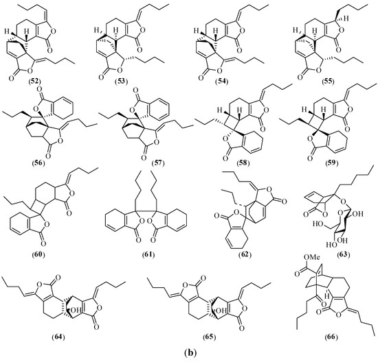 Phthalides are one kind of active compounds in CX with a phthalide parent nucleus and are used as characteristic components for quality control. Chemical structures of the main phthalides in CX are shown in Figure 2a,b, containing monomeric phthalides (compounds 19–51) and phthalide dimers (compounds 52–66) [9,10,100,101,102,103,104,105,106,107,108,109]. Takashi et al. [100,101,102,103] isolated about 30 phthalides from this herb in the 1990s, several of which were reported for the first time. Nowadays, some new phthalide and dimeric phthalides are isolated from CX in succession, such as 4,7-dihydroxy-3-butylphthalide (43), ligusticoside A (63) (a novel phthalide derivative with a lactone ring), chuanxiongnolide A (64), chuanxiongnolide B (65), 4,5-dihydro-3,1'-dihydroxy-3-pentylphthalide, and 4-pentylcyclohex-3-ene-1a,2b-diol [20,104,105]. Additionally, some compounds were found from this herb for the first time, such as n-hexadecanoic acid, daucosterol, 3-methylphthalide, and 3-butylidene-4,5-dihydro-2(1,3H)-1-isobenzofuranone [50,106].