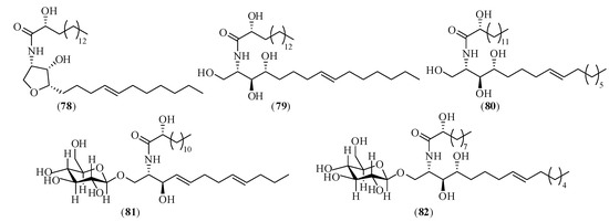 - Chen, Y.; Lü, J.L.; Duan, J.A.; Jiang, L.H.; Guo, J.M. Distribution of cerebroside from a viewpoint of organic evolution and advances of its biological activity. J. Int. Pharm. Res. 2009, 36, 121–126. [Google Scholar]
