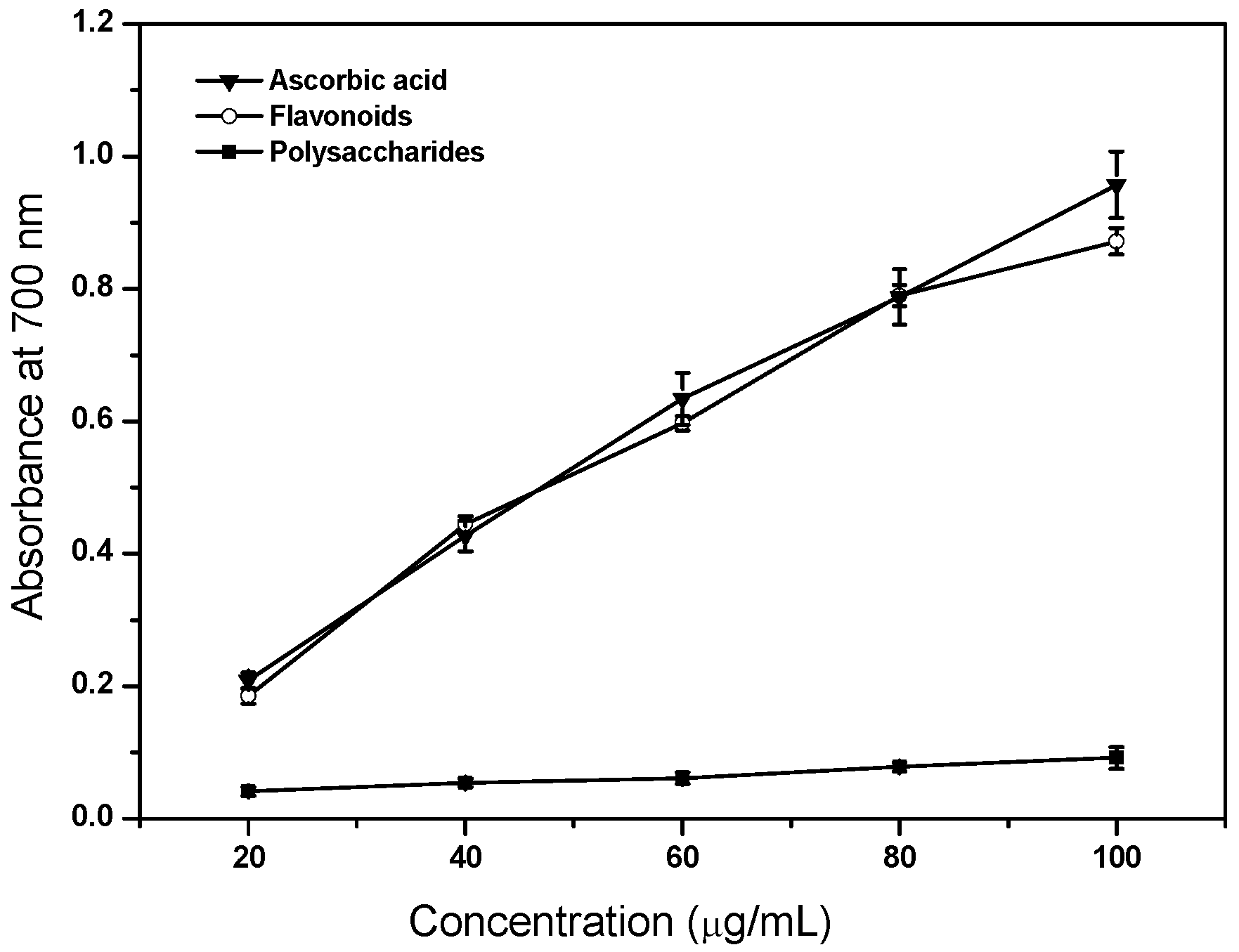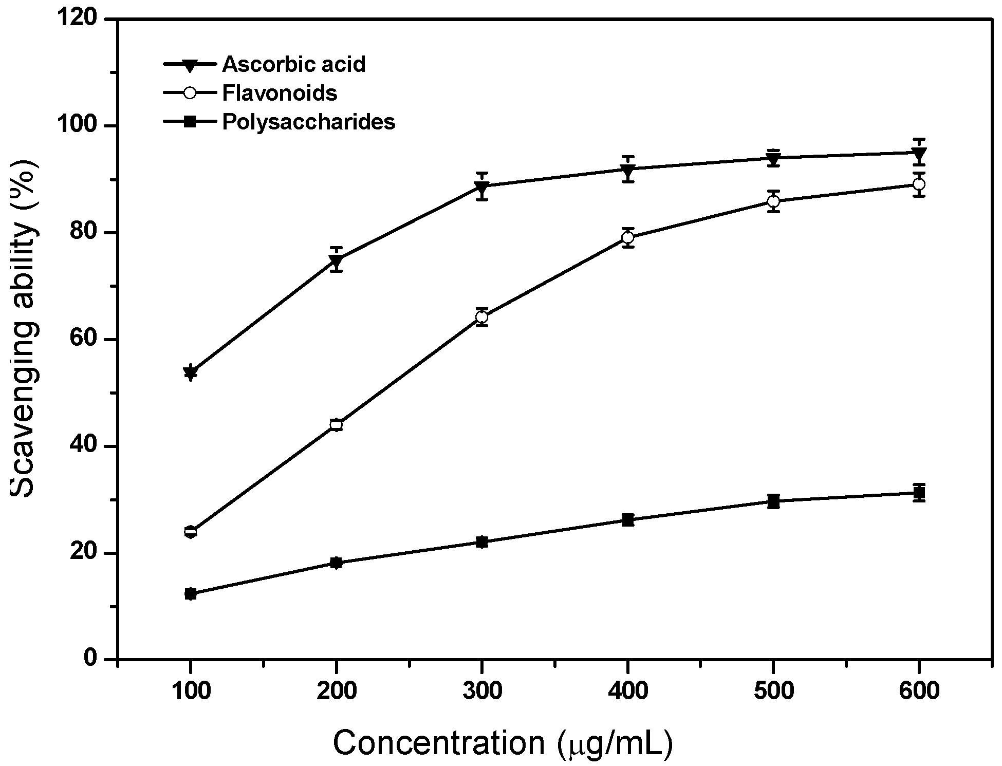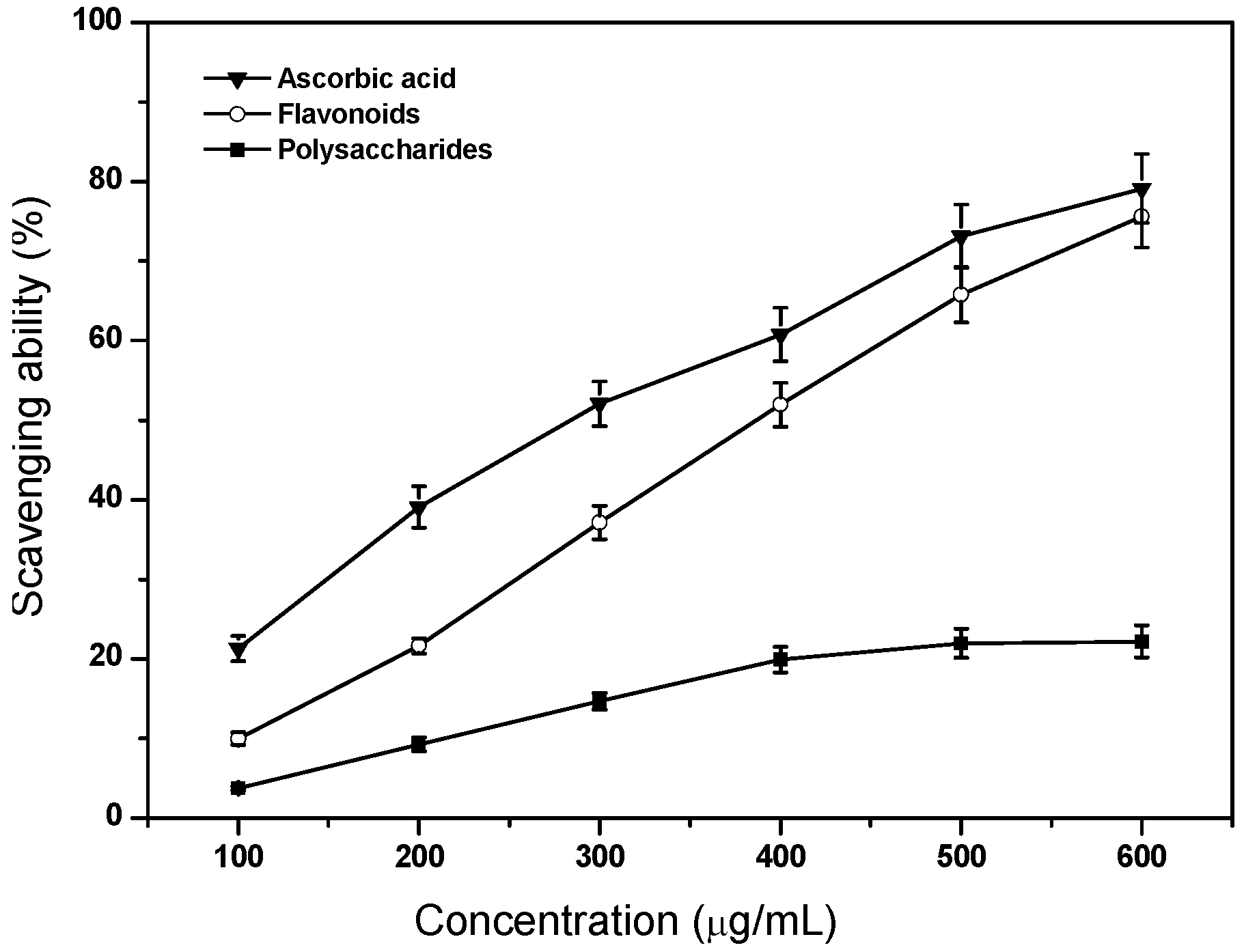 The effects of flavonoids and polysaccharides on superoxide anion radicals were determined and the results are shown in Figure 2. For the control treatment, the scavenging effect of ascorbic acid was substantially higher than those of flavonoids and polysaccharides (p < 0.05). However, flavonoids possessed comparable radical scavenging abilities with ascorbic acid when the tested concentration was at 600 μg/mL (p > 0.05). Flavonoids were effective scavengers for superoxide anion radicals, and could be advantageous for preventing injury induced by superoxide radicals in pathological conditions. A similar phenomenon was also observed in L. barbarum L. [9]. For flavonoids, the keto group at C-4' and hydroxy group at C-3' or C-5' of the C-ring were effective in scavenging superoxide anion, and the greater the number of hydroxy groups, the better is the scavenging activity [11]. Meanwhile, the hydroxy groups in the A- and B-rings in rutin should contribute to this effect due to their hydrogen donation ability [12].