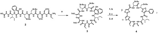 Cyclizing the linear precursor 2 utilizing our standard conditions [50] generated the cyclized compound 3 (Scheme 4, yield = 36%). Employing triethylsilane (TES):CH2Cl2 with 1.1% trifluoroacetic acid (TFA) in CH2Cl2 selectively removed the trityl protecting group (Trt) from serine in the presence of the tBu protecting groups on cysteines. Oxazoline formation was carried out by intramolecular cyclodehydration of serines using the fluorinating agent diethylamino sulfurtrifluoride (DAST) and pyridine/K2CO3 to afford all three intermediate oxazolines (yield = 47%). The oxazolines were oxidized using bromochloroform (BrCCl3) and 1,8-diazabicyclo[5,4,0]undec-7-ene (DBU) generating compound 4.