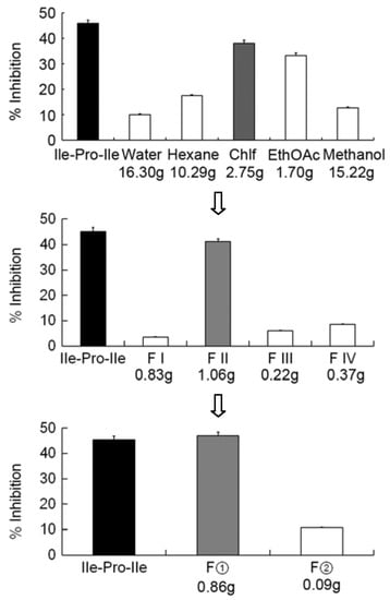 Activity-guided purification of the chloroform extract of mycelium powders. Gray represents active site. F: fraction. The results are expressed as the mean ± SD.