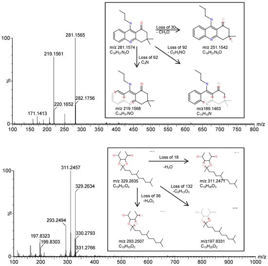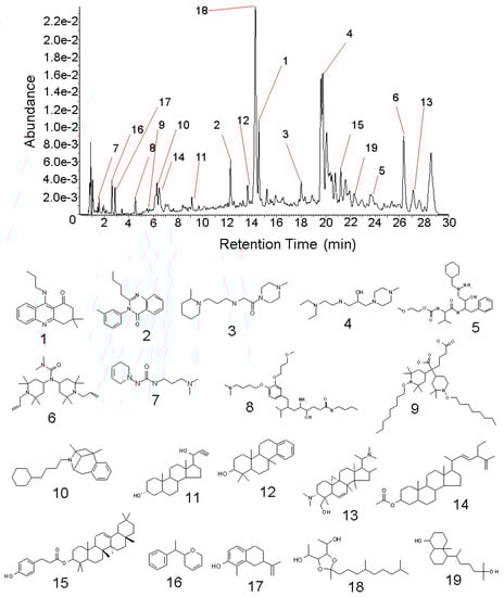 Using UPLC-Q-TOF-MS, nineteen compounds were characterized from the 12 fractions. The accurate masses and molecular formulas of these nineteen compounds (Table 1) were obtained using Mass Lynx 4.1 software. The elemental composition tool also generated the number of double-bond equivalents (DBE) and i-FIT and i-FIT (Norm) (Table 1). The mass errors of the nineteen compounds were all below 5 ppm, and their i-FIT (Norm) values were low, which indicated at least 95% confidence in the accuracy of the proposed composition. To confirm the structural formulas of the nineteen compounds, we imported the potential structural formulas and their raw data file into the software Massfragment to supply the structural formulas of the fragment ions and give the fragment “soft spot”. Then the “soft spot” information and the fragmentation data of the compound supplied by the TOF-MS-MS, together with the molecular formula calculated by from the accurate mass, were used to confirm the structural formulas. Nineteen proposed compounds were identified and are shown in Figure 2. All the compounds have not been previously identified in I. obliquus [28,29,30,31,32]. There were ten alkaloid compounds: 3,3-dimethyl-9-(propylamino)-3,4-dihydro-1(2H)-acridinone (1), 2-butyl-3-(3-methylphenyl)-4(3H)-quinazolinone (2), 1-(4-methyl-1-piperazinyl)-2-{[3-(2-methyl-1-piperidinyl)propyl]amino}ethanone (3), 1-{[2-(diethylamino)ethyl]amino}-3-(4-methyl-1-piperazinyl)-2-propanol (4), N-{(1S,2S)-1-benzyl-3-[1-(cyclohexylmethyl)hydrazino]-2-hydroxypropyl}-N2-[(2-methoxyethoxy)carbonyl]-L-valinamide (5), 1,1-dimethyl-3,3-bis(2,2,6,6-tetramethyl-1-prop-2-en-1-ylpiperidin-4-yl)urea (6), 1-(3,6-dihydropyridin-1(2H)-yl)-3-[3-(dimethylamino)propyl]urea (7), (2R,4S,5S,7S)-5-amino-N-butyl-7-{4-[4-(dimethylamino)-butoxy]-3-(3-methoxypropoxy)benzyl}-4-hydroxy-2,8-dimethylnonanamide (8), 2,2-bis[2,2,6,6-tetramethyl-1-(octyloxy)piperidin-4-yl]-hexane-dioate (9) and 3-(4-cyclohexylbutyl)-6,11-dimethyl-1,2,3,4,5,6-hexahydro-2,6-methano-3-benzazocine (10). The remaining ten compounds were steroids, triterpenoids and other types: (3R,5S,8R,9S,10S, 13S,14S,17S)-17-(1-hydroxyprop-2-ynyl)-10,13-dimethyl-2,3,4,5,6,7,8,9,11,12,14,15,16,17-tetradeca-hydro-1H-cyclopent-a[a]phenanthren-3-ol (11), (2S,4aR,10bR)-1,1,4a,10b-tetramethyl-1,2,3,4,4a,4b,5, 6,10b,11,12,12a-dodecahydrochrysen-2-ol (12), (3β,5α,9β,16α,20S)-3,20-bis-(dimethylamino)-4-(hydroxylmethyl)-4,14-dimethyl-9,19-cyclopregn-6-en-16-ol (13), (22E)-stigmasta-7,22,25-trien-3-yl acetate (14), (3β)-olean-12-en-3-yl-(4-hydroxyphenyl)propanoate (15), (2S)-2-[(1S)-1-phenylethyl]-3,6-dihydro-2H-pyran (16), ligudentatol (17), 1,6-dideoxy-3,4-O-(1,5,9-trimethyl-decylidene)-D-mannitol (18), (1S,4aR,5R,8aS)-5-[(1R)-5-hydroxy-1,5-dimethylhexyl]-4a-methyldecahydro-naphthalen-1-ol (19). Finally, the proposed structural formulas were elucidated by Massfragment to verify how much they matched the corresponding fragment information (two examples of matching information are shown in Figure 3).