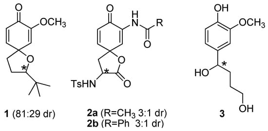 - Plourde, G.L.; Susag, L.M.; Dick, D.G. Determination of the absolute configurations of (+)-N-((3S)-3-{[(4-methylphenyl)sulfonyl]amino}-1-oxaspiro[4.5]deca-6,9-dien-2,8-dion-7-yl) acetamide and benzamide. Molbank 2008, M579. [Google Scholar] [CrossRef]