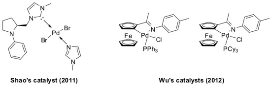 Traditional palladium catalysts for the coupling of arylboronic acids with anhydrides have been recently successfully replaced by new generation catalysts. For example, the use of coordinated monodentate NHC–Pd(II) complex derived from N-phenyl substituted proline has been reported by Shao in 2011 in the coupling reaction of arylboronic acids with benzoic anhydride in water [38], and cyclopalladated ferrocenylimines catalysts have been recently explored by Wu and coworkers [39] in the cross-coupling of arylboronic acids with carboxylic anhydrides (Figure 1).