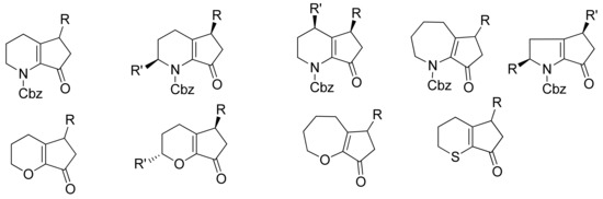 - Bartali, L.; Larini, P.; Guarna, A.; Occhiato, E.G. Preparation of cyclopenta-fused N-, O-, and S-heterocycles by Lewis acid catalyzed Nazarov reaction. Synthesis 2007, 1733–1737. [Google Scholar] [CrossRef]