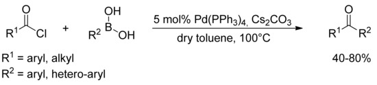 The classic Suzuki coupling reaction, which is generally carried out as a palladium-catalyzed reaction in organic solvent and water, has proven to be poorly suitable for the coupling of acyl chlorides with boronic acids. However, Haddach and coworkers [21] reported in 1999 as an alternative method the first palladium-catalyzed coupling of organoboronic acids with acyl chlorides under anhydrous reaction conditions (Scheme 2). By means of catalytic Pd(PPh3)4 and cesium carbonate in dry toluene, several symmetric and non-symmetric aromatic ketones have been synthesized in moderate to good yields.