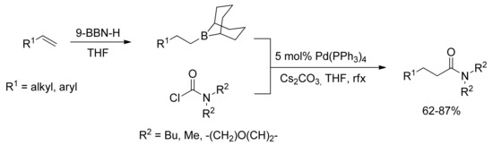 In 2007 Takemoto and coworkers reported a one-pot amidation of olefins through the first palladium-catalyzed coupling reaction of carbamoyl chlorides with alkylboranes [50]. Hydroboration of olefins and subsequent coupling of the resulting alkylboranes with carbamoyl chlorides have proven to be a promising synthetic route for the generation of amides starting from unactivated alkenes (Scheme 11). Moreover, carbamoyl chlorides have been successfully coupled with arylboronic acids in a copper-free Suzuki coupling reaction in the presence of catalytic Pd(PPh3)4.
