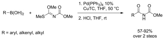 Very recently the preparation of imides via the palladium-catalyzed coupling reaction of aryl-, alkyl-, and alkenylboronic acids with N-[methoxy(methylthio)methylene]carbamate in the presence of Cu(I) thiophene-2-carboxylate (CuTC) has been described. The reaction afforded imino ethers that were easily converted to the corresponding imides by acidic hydrolysis in high yield. (Scheme 13) [52].