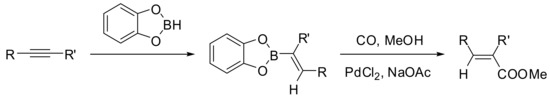 Suzuki-Miyaura carbomethoxylation of alkenylborane derivatives.