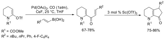 This methodology for the preparation of unsymmetrical divinyl ketones was subsequently extended by the same research group to five- and six-membered heterocyclic systems namely lactams, lactones, and thiolactones [75,76,77]. Good to excellent yields (60%–86%) were obtained in particular with N-heterocyclic vinyl triflates, while good overall yields over two steps (50%–57%) were also obtained with lactone- and thiolactone-derived enol triflates.