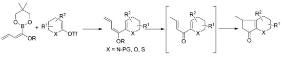 Alkoxydienyl- and alkoxystyrylboronates were used for Pd-catalyzed cross-coupling reactions with lactam-derived vinyl triflates (Scheme 22). The hydrolysis of the coupling products with alkoxystyrylboronates provided the corresponding N-acyl-substituted 3,4-dihydro-(2H)-pyridines and 2,3,4,5-tetrahydroazepines in good to high yields. The hydrolysis of the coupling products with alkoxydienylboronates, performed in the presence of Amberlyst-15®, resulted in a Nazarov-type cyclization that afforded hexahydro[1]pyrindin-7-ones and 3,4,5,6,7,8-hexahydro-(2H)-cyclopenta[b]azepin-8-ones. This methodology represents a novel and efficient procedure for the preparation of these classes of azacyclic compounds [79].