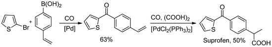 Despite the direct acylation of organoboron derivatives has proved to be an attractive approach to the formation of symmetric and unsymmetrically substituted ketones, the carbonylative Pd-catalyzed coupling reaction has been widely employed for the synthesis of aromatic ketones [12]. Depending on the substrates used, catalytic carbonylation leads to a variety of carbonyl-containing compounds and dicarbonyl compounds. As mentioned above, diaryl ketones are target molecules of importance for organic synthesis since the diarylketo moiety occurs in many natural and synthetic biologically active molecules, as well as in non-steroid anti-inflamatory drugs [53]. Aryl halides with various coupling partners have found success including stannanes [54,55,56], magnesium [57], aluminum [58], and silane derivatives [59], as well as boronic acids [60,61].