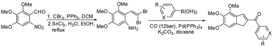 At the same time, Rolando and coworkers successfully applied Haddach’s conditions [21] in the coupling reaction between different aryl chlorides and substituted cinnamoyl chlorides leading to a variety of substituted chalcones in near quantitative yield [24]. This approach allowed the access to naturally occurring chalcones starting from suitably methoxylated substrates, as reported in Scheme 4.