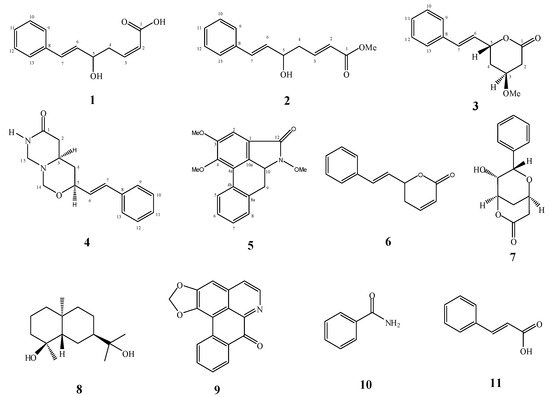 In our continuous effort to search for new and bioactive compounds from the Malaysian flora [7,8,9,10], we have embarked on a chemical study of the cytotoxic stem bark extracts of G. tapisoides Mat Salleh. To the knowledge of the authors, such a phytochemical study of this planthas never been reported. From this study, the eleven compounds shown in Figure 1 were isolated, of which five are new: goniomicin A (1), goniomicin B (2), goniomicin C (3), goniomicin D (4) and tapisoidin (5). The known compounds are goniothalamin (6), 9-deoxygoniopypyrone (7), pterodondiol (8), liriodenine (9), benzamide (10) and cinnamic acid (11). Compounds 16 were tested for cytotoxic activity against eight cancer cell lines and for antioxidant activity.