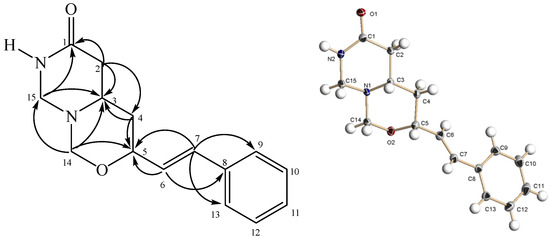 The 1H-NMR spectrum showed four methylene signals at δ 2.28/2.64 (H2-2), δ 1.74 (H2-4), δ 4.13/4.64 (H2-14) and δ 3.82/4.34 (H2-15) (Table 3). The downfield shift of H2-14 and H2-15 were due to the neighboring nitrogen and oxygen. The 13C-NMR showed signals corresponding to fifteen carbons: four methylenes, nine methines, one quaternary and one carbonyl carbon. The methylene carbons C-14 and C-15 resonated downfield at δ 82.9 and δ 58.9, respectively. The carbonyl carbon (C-1) gave a peak at δ 168.9. The HMBC spectrum (Figure 1) revealed cross peaks betweenthe methylene at δ 4.13/4.64 (H2-14) and C-3 (δ 54.1), C-5 (δ 77.3) and C-15 (δ 58.9). Two methylene signals of H2-2 (δ 2.28/2.64) and H2-15 (δ 3.82/4.34) were correlated to the carbonyl C-1. From a 1H–1H COSY experiment, the entire sequence C-2–C-3–C-4–C-5–C-6 was identified.Thorough analyses of 1D and 2D NMR data analyses allowed the full assignment of all protons and carbons as listed in Table 3.