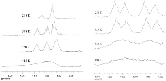 The determination of the rotational barrier using DNMR is exemplarily demonstrated for 7c and 7d (Figure 3). In both cases the signals of methylene groups adjacent to ester oxygen atoms are suitable for application of the method. For 7c we observed a coalescence temperature of 418 K, whereas for 7d the coalescence of the signals were reached at 398 K. Accordingly, the rotational barriers were calculated to be 20.6 kcal/mol (7c) and 19.6 kcal/mol (7d) respectively. The enantiomers of compound 8b could not be separated by chiral HPLC and DNMR experiments failed due to insufficient quantities of this substance. Compound 8c represents a special case. Even cooling of the column to 4 °C (the experimental lower limit) does not result in the formation of a plateau but only in broadening of the peaks. Therefore the barrier must be lower than 20 kcal/mol. On the other hand, DNMR experiments reach at 418 K the upper experimental limit without complete coalescence of the signals. Because the signals already considerably broadened, we estimate a coalescence temperature of 430 K giving a rotational barrier of about 20 kcal/mol. The determined barriers are summarized in Table 3. The slightly increasing barrier from 8c to 8e could be explained by steric hindrance of medium-sized rings.