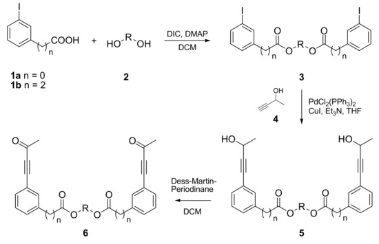 The synthesis of PDDA reactants was accomplished in three steps starting with commercially available 3-iodobenzoic acid (1a) and with 3-(3-iodophenyl)propionic acid (1b), respectively. The latter one was prepared from 3-iodobenzaldehyde and Meldrum’s acid according to Kawasaki et al. [14]. In the first step acids 1 were esterified with various diols 2 (for R see Table 1) using Steglich’s method [15]. The diesters 3 obtained in this way were subjected to a Sonogashira coupling [16] with 3-butyn-2-ol (4) under standard catalytic conditions giving compounds 5. In the third step the secondary hydroxyl groups in 5 were oxidized with Dess-Martin periodinane [17,18] yielding bisynones 6 (Scheme 1). The yields of these three steps are almost always good to excellent and are summarized in Table 1.