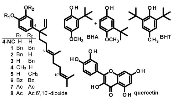 Structures of 4-NC (4-nerolidylcatechol), semi-synthetic derivatives of 4-NC 1–8 and synthetic food additives BHA (butylated hydroxyanisole) and BHT (butylated hydroxytoluene) and the flavonoid quercetin.