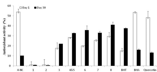 The antioxidant activity of 4-NC and semi-synthetic derivatives of 4-NC was evaluated on the 1st and 30th days after dissolving the substances in DMSO at a concentration of 10 mM and storage in a freezer at −20 °C. This experiment permitted the evaluation of the relative stability of the antioxidant activity of 4-NC, derivatives of 4-NC, BHT and BHA. Thus, cellular antioxidants were evaluated using the mouse embryonic fibroblast 3T3L1 cell line. From the results of this assay, it was evident that some of the derivatives of 4-NC exhibited greater stability in solution than did 4-NC, BHA or BHT. The presence of mono-O or di-O,O substituent groups in the 4-NC derivatives can confer stability relative to 4-NC. Such chemical stability is highly desirable when contemplating the use of such substances in cosmetic and pharmaceutical formulations and foods. Here, 4-NC dissolved in DMSO lost more than 80% of its antioxidant activity after 30 days in the freezer. Also, significant losses of antioxidant activity were observed after 30 days for DMSO solutions of BHT and BHA. Derivatives of 4-NC that were significantly active on the 1st day did not exhibit lower antioxidant activity after 30 days in DMSO solution at −20 °C thus attesting to high antioxidant activity and high stability of the antioxidant effect of derivatives of 4-NC in DMSO solution over time as compared to 4-NC, BHT and BHA (Figure 2).