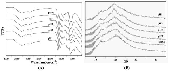 (A) FT-IR spectra of TPP-CG composites and (B) X-ray diffraction (XRD) patterns of TPP-CG composites prepared at different pH of tripolyphosphate.