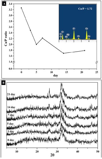 Energy-dispersive X-ray spectroscopy (EDX) mapping of Ca and P shows that the mineral patterns are mainly composed of calcium phosphates. After immersion in 1.5 × SBF for 21 days, the Ca/P molar ratio for the nanocomposite was about 1.72 (Figure 5A), which approached the Ca/P molar ratio of HAp (Ca/P = 1.67). The X-ray diffraction patterns from these samples exhibit several reflections at 2θ = 26° and 32°, which correspond to the characteristic peaks of HAp (Figure 5B). EDX analysis and X-ray diffraction clearly show that the mineral phase deposited in the matrix of the template should be constituted of HAp-like materials.