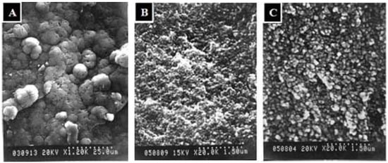 The formation of spherical aggregates of calcium phosphates can be attributed to the strong affinity between calcium ions and the functional groups on the surface, leading to the 2-dimensional outward growth of micro-scale calcium phosphate. The spherical aggregates of calcium phosphates demonstrated relatively high Ca/P ratios because they lack hydrolyzed TPP polyions on the surface of the templates. Scanning electron microscope (SEM) investigation of the mineralized TPP-CG composites (cross-section) showed different sizes of mineral nanoparticles deposited in the matrix of the composite after 3 days (~50 nm) and 21 days (~150 nm) of mineralization (Figure 6B,C). However, the sizes of those nanoparticles grown in the composite are smaller than the spherical aggregates (5~20 μm) deposited on the surface (Figure 6A). The size and shape change by TEM (granule-like nanocrystallites, Figure 4C) and SEM (micro-scaled spherical aggregates, Figure 6A) is due to the different mechanism in crystallization of calcium phosphate respective on the surface and in the matrix of the TPP-CG composite templates, due to limited crystal growth by the polymer matrix. The mineralized nanoparticles have been previously characterized by EDX mapping and X-ray diffraction to shows that it should be constituted of HAp-like materials (Figure 5A,B).