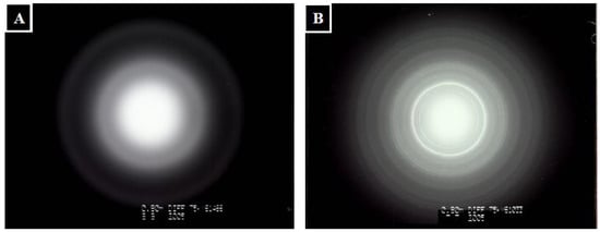 TEM electron diffraction patterns of (A) original TPP-CG composites and (B) mineral deposition on TPP-CG composites immersed in 1.5 × SBF for 21 days after pretreated with Ca(OH)2.