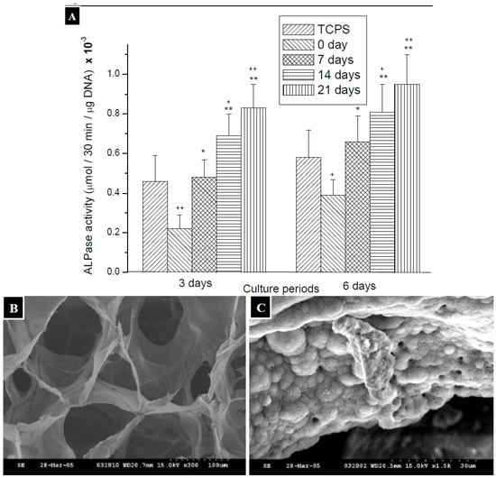 (A) The changes of ALPase activity in ROS cells cultured with TCPS and chitosan films which were treated with biomimetic body fluid for 0 days, 7 days, 14 days and 21 days. Significance (t-test) is indicated: * p < 0.05, ** p < 0.01 compared with 0 days films for the same culture time, + p < 0.1, ++ p < 0.05 compared with TCPS for the same culture time (n = 4). (B) SEM micrography of the porous TPP-CG scaffold. (C) SEM micrography on the wall of the pores of the TPP-CG scaffold mineralized with calcium phosphates.