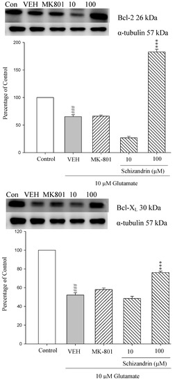 Comparison of western blot analysis of schizandrin on glutamate-induced protein expression level change of Bcl-XL, Bcl-2 and α-tubulin in rat cortical cells. Cortical cells were pretreated with schizandrin (10 and 100 μM) or MK-801 (15 μM) 2 h before exposure to 10 μM glutamate and then maintained for 24 h. ### p < 0.001 as compared with control group (the protein without glutamate and schizandrin treatment). *** p < 0.001 as compared with VEH group (only glutamate treatment). (N = 3). α-Tubulin was used as an internal loading control.