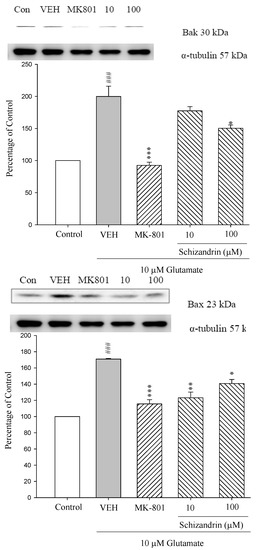 Pro-apoptotic members of the Bcl-2 family are functionally and structurally divided into two subgroups: multi-domain proteins and ’BH3 domain-only proteins. The most extensively characterized multi-domain pro-apoptotic proteins are Bax and Bak. The activation and oligomerization of Bax and/or Bak leads to disruption of mitochondrial integrity and the release of apoptogenic factors [20]. As shown in Figure 2 the protein levels of Bak and Bax were increased at 24 h exposure to 10 μM Glu (### p < 0.001). Pretreatment of the cell cultures with schizandrin (100 μM) and MK-801 (15 μM) for 2 h significantly attenuated the protein level changes of Bak and Bax compared with those only treated with Glu (p < 0.05–0.001). Indeed, accumulating evidence suggests that multimers of Bax and Bak form pores that are permeable to cytochrome c [23,24]. This is in agreement with our previous results which indicate schizandrin significantly decreased the cytochrome c release increased by Glu insult [19].
