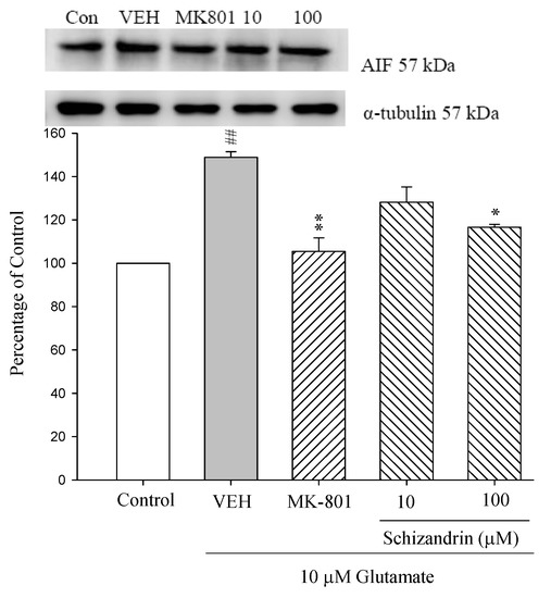 Comparison of western blot analysis of schizandrin on glutamate-induced protein expression level change of AIF, Nod G and α-tubulin in rat cortical cells. Cortical cells were pretreated with schizandrin (10 and 100 μM) or MK-801 (15 μM) 2 h before exposure to 10 μM glutamate and then maintained for 24 h. ## p < 0.01 as compared with control group. * p < 0.05, ** p < 0.01 as compared with VEH group (N = 3). α-Tubulin was used as an internal loading control.