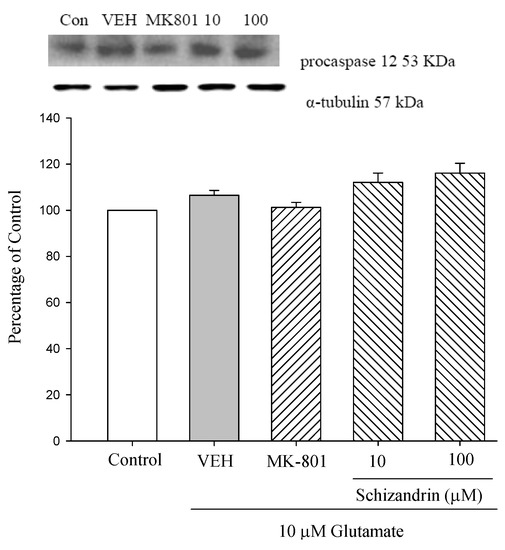 2.4. Western Blot Analysis of the Effects of Schizandrin on Glu-Induced Protein Level Changes of Procaspase 12 and Caspase 12 in Rat Cortical Cell Cultures