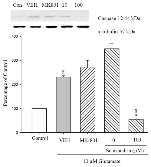 Comparison of western blot analysis of schizandrin on glutamate-induced protein expression level change of procaspase 12, caspase 12 and α-tubulin in rat cortical cells. Cortical cells were pretreated with schizandrin (10 and 100 μM) or MK-801 (15 μM) 2 h before exposure to 10 μM Glu and then maintained for 24 h. ### p < 0.001 as compared with control group. *** p < 0.001 as compared with VEH group (N = 3). α-Tubulin was used as an internal loading control.