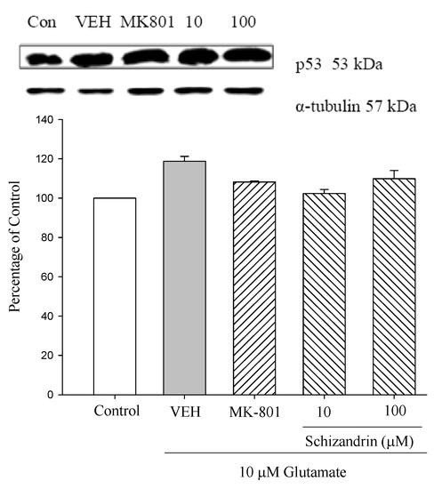 Comparison of western blot analysis of schizandrin on glutamate-induced protein expression level change of p53 and α-tubulin in rat cortical cells. Cortical cells were pretreated with schizandrin (10 and 100 μM) or MK-801 (15 μM) 2 h before exposure to 10 μM glutamate and then maintained for 24 h (N = 3). α-Tubulin was used as an internal loading control.