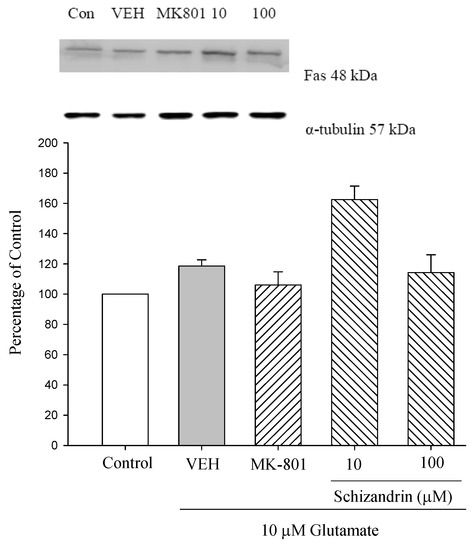 Comparison of western blot analysis of schizandrin on glutamate-induced protein expression level change of Fas and α-tubulin in rat cortical cells. Cortical cells were pretreated with schizandrin (10 and 100 μM) or MK-801 (15 μM) 2 h before exposure to 10 μM glutamate and then maintained for 24 h (N = 3). α-Tubulin was used as an internal loading control.