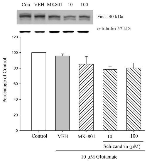 2.6. Western Blot Analysis of the Effects of Schizandrin on Glu-Induced Protein Level Changes of Fas and FasL in Rat Cortical Cell Cultures