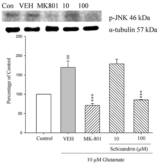 2.7. Western Blot Analysis of the Effects of Schizandrin on Glu-Induced Protein Level Changes of Phosphor-JNK and α-Tubulin in Rat Cortical Cell Cultures