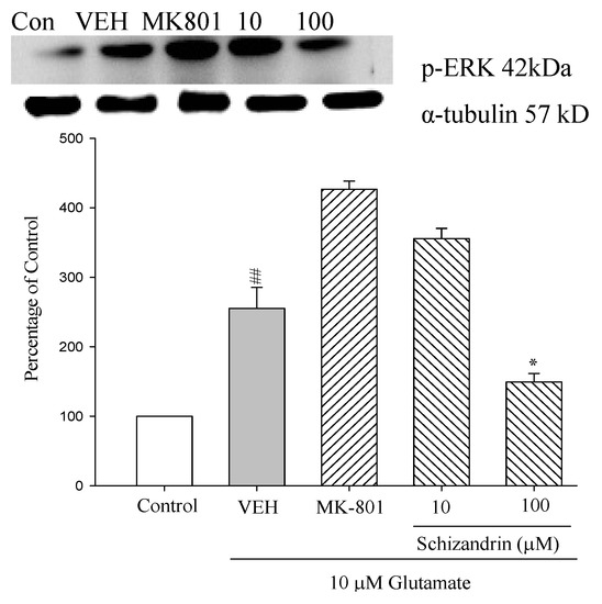 Comparison of western blot analysis of schizandrin on glutamate-induced protein expression level change of phospho-ERK and α-tubulin in rat cortical cells. Cortical cells were pretreated with schizandrin (10 and 100 μM) or MK-801 (15 μM) 2 h before exposure to 10 μM glutamate and then maintained for 24 h. ## p < 0.01 as compared with control group. * p < 0.05 as compared with VEH group (N = 3). α-Tubulin was used as an internal loading control.
