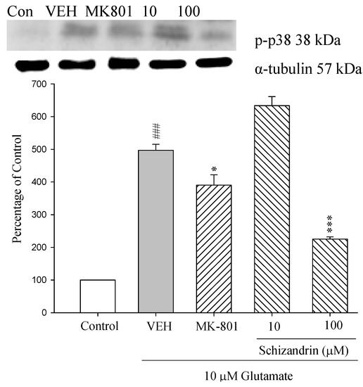 The studies indicated that Glu also induces strong activation of p38 and indeed, cell death can be prevented by inhibitors of the p38 pathway [16]. However, little is known about the neuroprotective effect of schizandrin and p38 activation on Glu-induced neuronal death. As shown in Figure 9 the protein level of p-p38 was increased at 24 h exposure to 10 μM Glu compared with control (p < 0.001). Pretreatment of the cell cultures with schizandrin (100 μM) and MK-801 (15 μM) for 2 h significantly attenuated the protein level changes of p-p38 compared with those only treated with Glu (* p < 0.05 and p < 0.001). This study also showed that schizandrin inhibited p-p38 activation to reduce cell death. The protective effects of schizandrin against apoptosis were confirmed by attenuation of p-p38 activation.