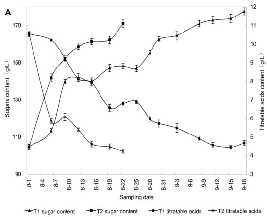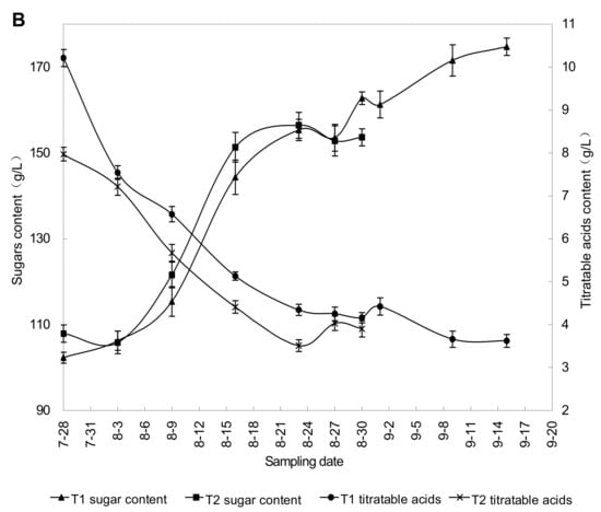 The sugar content and titratable acids were quantified according to the National Standard of the People’s Republic of China [].