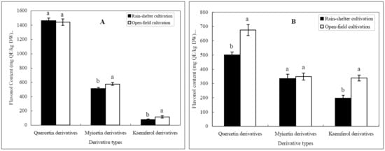 The last group of flavonoids is the flavonols, which seem to be responsible for bitterness and color []. They also contribute to the color stabilization of red wines by reinforcing the pigmentation due to anthocyanins, a phenomenon known as co-pigmentation []. Generally, they originate from the berry skins of grapes, and are transferred to the wine during the process of winemaking. In present study, rain-shelter cultivation lowered the level of total flavonols in grape berries, which may be caused by low solar radiation and high air humidity [,]. Based on the differences in their biosynthesis pathway in grape berries, flavonols could be classified into three groups: kaemferol derivatives, quercetin derivatives and myicetin derivatives. Their content in grape berries is shown in Figure 2. It was easily found that flavonol profiles were dominated by quercetin derivatives. It suggests the directional flow of carbon to the quercetin synthetic branch. In addition, dihydroquercetin-3-rhamnoside was detected in all the grape samples and its content in grape samples under rain-shelter cultivation was significantly higher than those under open-field cultivation. Considering that dihydroflavonols (flavanonols) are precursors of flavonols [], the high concentration of dihydroflavonols and low concentration of flavonol could be related with a lower activity for flavonol synthase (FLS) of grapes under rain-shelter cultivation compared with those under open-field cultivation. With regard to the sum of flavonols, their content in present study rang from 1032.04 to 2131.01 mg QE/kg DW, which was significantly higher than that in Cabernet Gernischet grape from the foot of Qilian Mountain on the ancient Silk Road in northwest China [], and Syrah grape from the Maipo Valley of Chile.