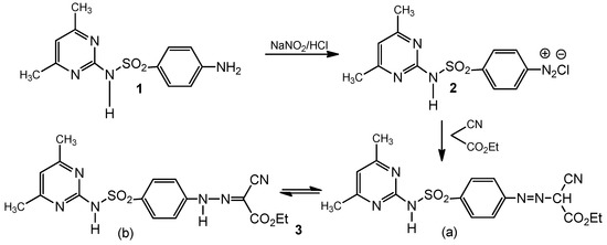 Synthesis of the precursor hydrazone 3 was achieved by diazotization of sulfamethazine, [N1-(4,6-dimethyl-2-pyrimidinyl)sulfanilamide, 1] followed by coupling with ethyl cyanoacetate in the presence of sodium acetate at room temperature [19] (Scheme 1). The spectral data revealed that this compound exists in the hydrazone form (b), as the 1H-NMR spectrum showed two (exchangeable) signals at 6.91 and 9.12 corresponding to two NH groups and the MS indicated the molecular ion peak at 402, which is in accordance with the molecular formula.