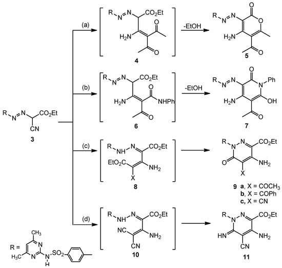 3.1.3. Reaction of 3 with β-ketoesters, β-cyanoesters and β-dicarbonitriles; Formation of 9a–c and 11